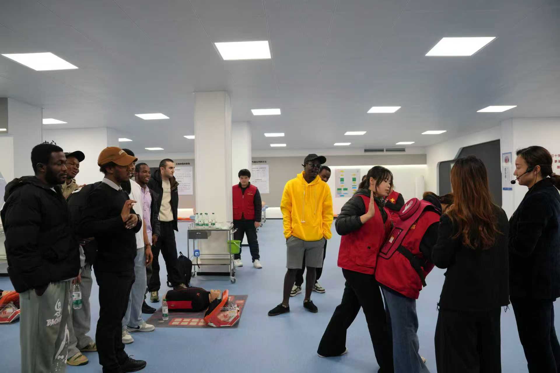 在红十字应急救护师资双语讲解下,留学生们走进理论教学区、ICU模拟病房、心肺复苏实训中心、创伤救护实训中心,认真聆听学校急救课程体系建设情况和急救培训志愿服务开展情况。留学生们不时举手详细询问各类急救器材功能用途与使用场景。