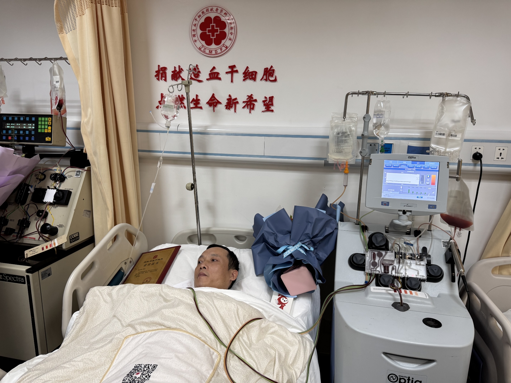 2025年10月21日,中南大学湘雅医院31病室造血干细胞移植采集室,来自市红十字会people(化名)先生经过近6小时的采集,提取292毫升造血干细胞混悬液,为一位素未谋面的血液病患者送去重生希望。他也成为中华骨髓库第21310例、湖南省第1413例、益阳市第51例非血缘造血干细胞捐献者。这位平时为他人生命奔走的“人道宣传员”,用自己的实际行动,完成挽救生命的承诺,成为大爱接力的“最美践行者”。