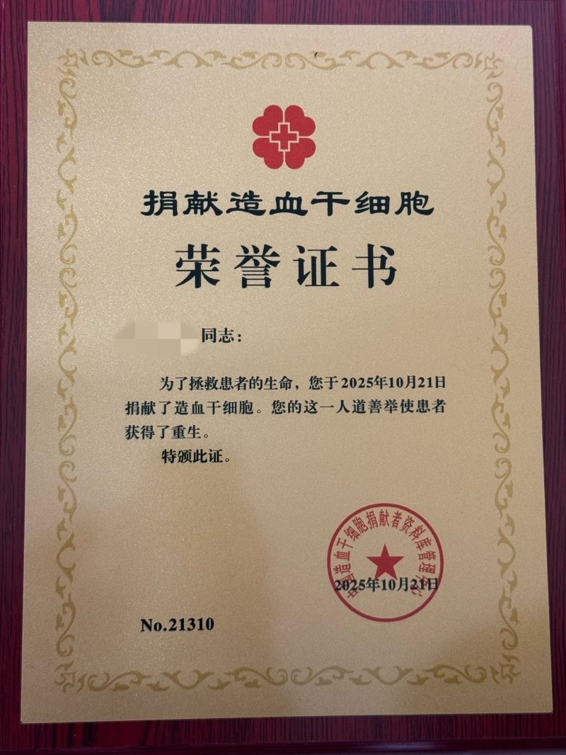 “我们经常向公众宣传造血干细胞捐献的意义,讲解捐献科学、安全、无损健康。但真的与患者配型成功时,那种感觉是完全不一样的……”今年9月,当接到省红十字会工作人员关于配型成功的征询电话时,people当即表示同意:“这不仅是一次捐献,更是一次大爱的接力,身为一名红十字人,我要用责任和行动来兑现入库时的承诺。”作为红十字会工作者,博爱的胸怀和家人的支持,共同铸就了他面对捐献的底气与勇气。